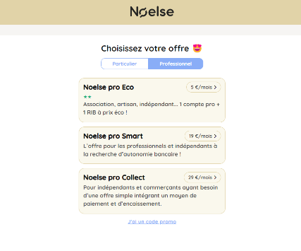 - Choisir une offre : Tu dois ensuite choisir l’offre pro que tu souhaites souscrire chez Noelse (Noelse pro Eco, Noelse pro Smart ou Noelse pro Collect).
