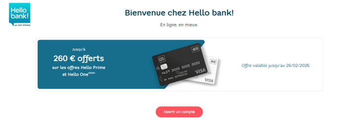 - Prime de bienvenue jusqu'à 180€ avec Hello One et Hello Prime (jusqu'au 26/03/2026). Offre soumise à conditions.