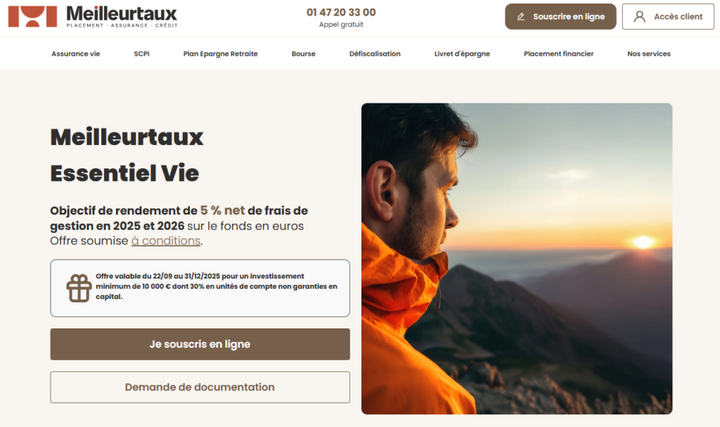 👌Notre avis : Le contrat Meilleurtaux Essentiel Vie est un contrat accessible qui répondra aux attentes d'investisseurs novices ou cherchant la sécurité et de faibles coûts.