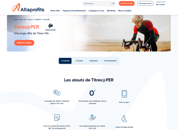 Spécialiste de l'assurance-vie en ligne et du PER, Altaprofits propose deux offres de plan épargne retraite. C'est ici le contrat Titres@PER assuré par SwissLife que nous avons retenu pour notre comparatif.