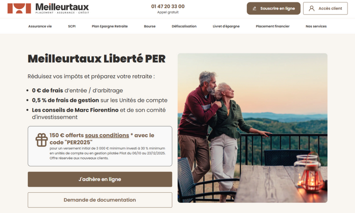 Assuré par Spirica filiale à 100% du Crédit Agricole, le PER Meilleurtaux Liberté se distingue par ses grandes possibilités d'investissement. Des supports nombreux et variés, un fonds en euros performant, des frais réduits, le choix de gérer seul, en gestion pilotée ou en mixte, bref ce PER saura séduire tous les profils d'investisseurs, du débutant au plus confirmé !