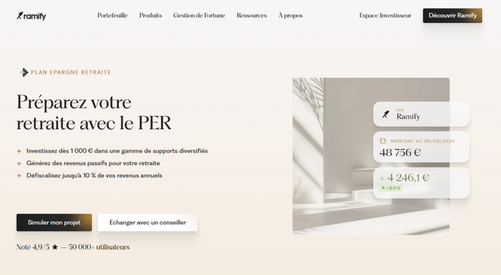 - PER Ramify Élite : le PER haut de gamme avec un maximum de diversification. C'est ici le Private Equity qui complète l'offre, pour un accès privilégié à des produits premium.