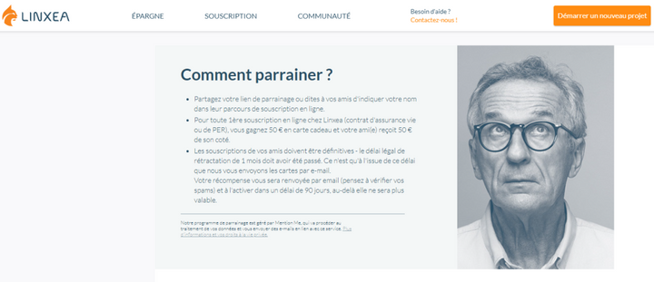Linxea propose en effet une offre de parrainage. Si tu connais une personne déjà cliente chez Linxea, tu peux lui demander son code de parrainage. Tu recevras alors une prime de bienvenue de 50 €, et de son côté elle bénéficiera d’une carte cadeau de 50 €.
