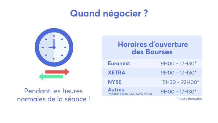 - Dans la mesure du possible, essaie d’acheter et de vendre uniquement pendant les heures d’ouvertures des bourses de référence. En dehors, de ces heures officielles de cotation, tu peux avoir à payer des frais supplémentaires (voir spread).