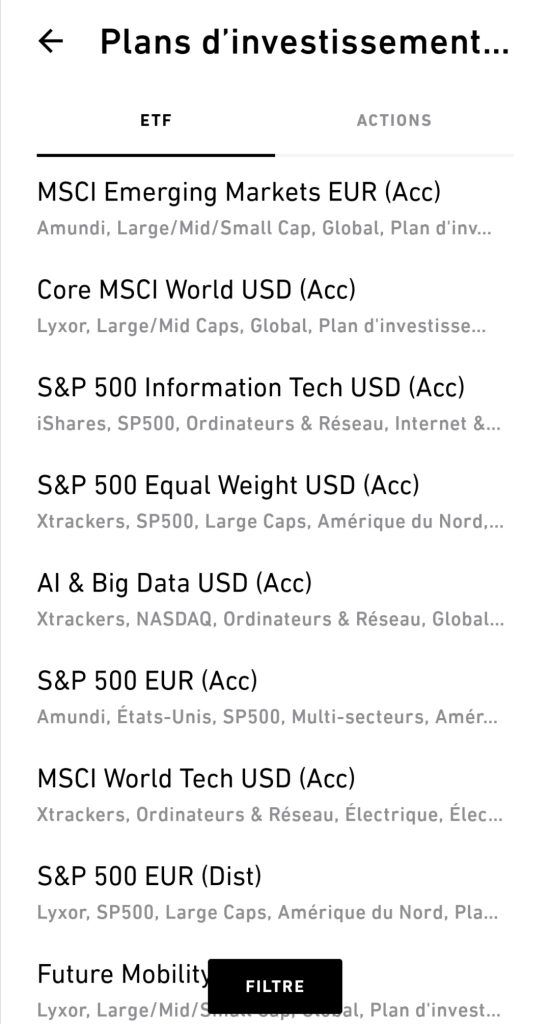 Ne te laisse pas griser par la grande offre d'ETF proposée. Grâce au filtre de recherche de ton courtier, sélectionne le fonds que tu as minutieusement choisi grâce aux critères que tu as appris dans ce guide. Tu trouveras facilement ton ETF à l'aide de son numéro ISIN et tu pourras ainsi l’intégrer à ton plan d’investissement programmé. Pour chaque ETF il existe une fiche technique qui te donne de nombreuses informations qu’il est judicieux d’étudier avec attention .
